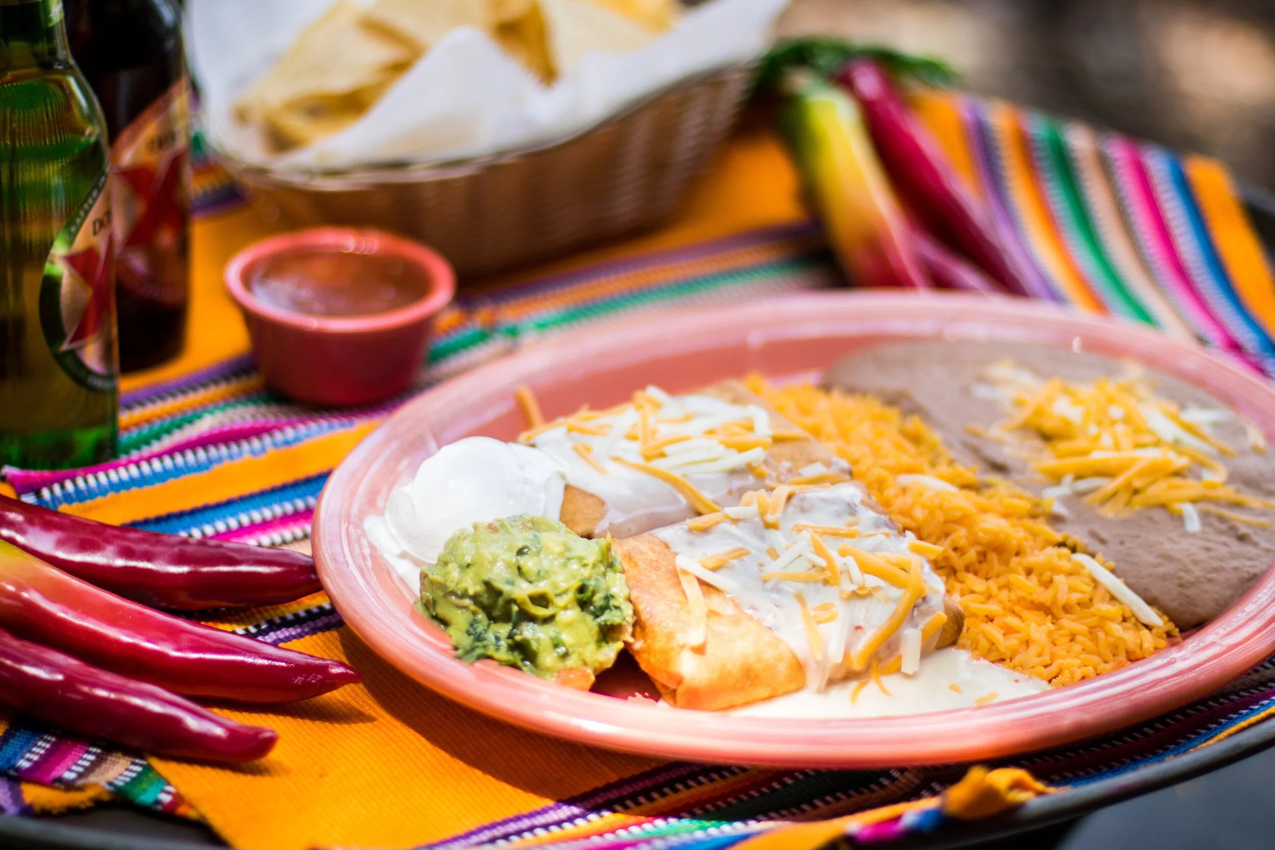 Chicken and cheese, stuffed and rolled in corn tortillas, fried and served with rice and beans $14.00